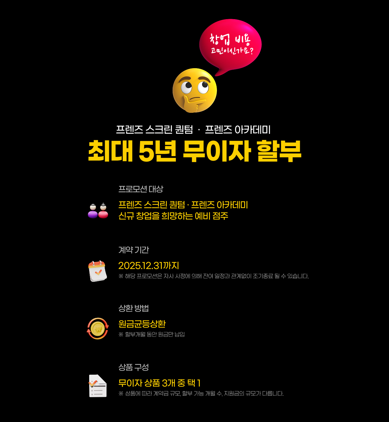 프렌즈 스크린 Q 신규 매장 오픈 시, 간판 시공 및 공사비 일부를 본사에서 지원해드립니다.(본사 정책에 따라 변경 될 수 있습니다.)